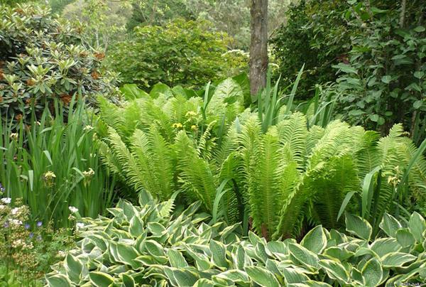 (Matteuceia struthiopteris). Весной из почвы появляются скрученные, словно улитки, вайи. Они вырастают до 1,5 метров в высоту и образуют большую воронку. Весной страусник может пострадать от заморозков, а в сухое лето нуждается в поливе. Высоким и сочным разрастается страусник только в полутени, на открытом месте вайи будут бледными и не столь высокими, не более 60–80 сантиметров. У страусника ползучее корневище, он дает много отводков и для маленького сада может стать даже сорняком. Но все же страусник очень хорош, и не следует отказываться от него из-за его агрессивности.