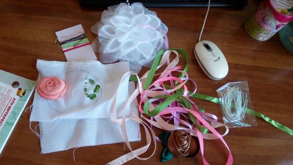 Несколько отрезов ткани - остаток от тюля (светленькая в полосочку кусочек) уже раскроила, будет очень полезная штука, для нее и металлическая стержень у сына отобрала, потом покажу, что получится (надеюсь, что получится, как задумано)