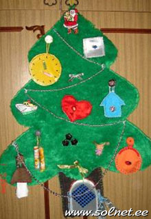 На верхушке новогодней красавицы вместо традиционной звезды я посадила крупную аппликацию в виде Санта Клауса с подарками, который крепится на липучку. Таким образом, в теплое время года, когда новогодняя тема уже не актуальна, туда можно прицепить что-нибудь другое - белочку, например. Также я постаралась использовать различные геометрические формы: круг, квадрат, треугольник. Под Сантой на желтую пуговицу крепятся такие же желтые часики из мех-велюра, который очень приятен на ощупь (кстати, пуговки к каждой ёлочной игрушке подобраны по цвету, чтобы ребёнок позже мог сам развешивать их по местам). Цифровые деления вышиты черным блестящим стеклярусом, а стрелки - карандаши-пуговки.
