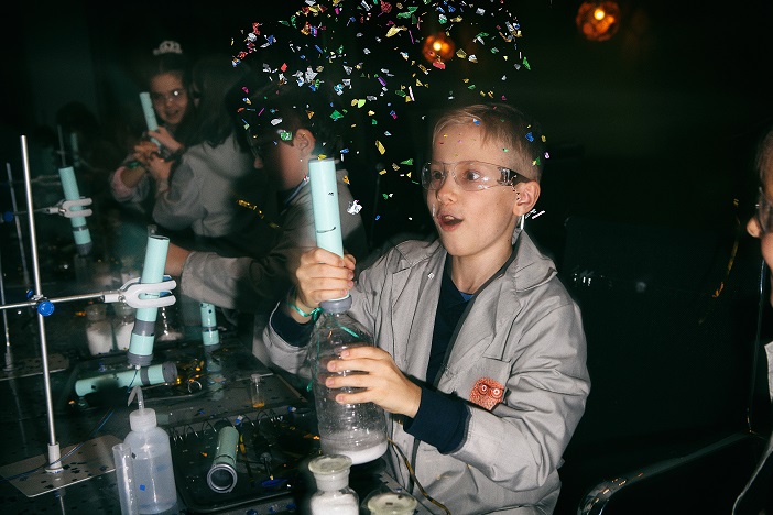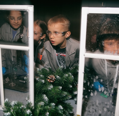 Дети не смотрят представление, а сами его создают. Надев лабораторные халаты, они становятся участниками научного приключения: проводят опыты по физике и химии, чтобы спасти Новый год. Программа разделена по возрастным группам (5-6 и 7-14 лет), в группах до 20 человек. Все эксперименты безопасны.
