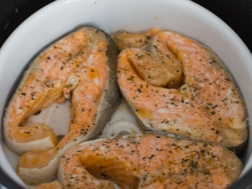 Стейки форели промываем, высушиваем бумажными полотенцами, солим, перчим по вкусу и выкладываем в кастрюлю мультиварки. Готовим в режиме “Выпечка” 10 минут, по 5 минут с каждой стороны.
