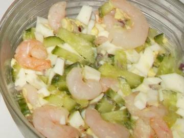 Креветки отварные ( или можно взять готовые в маринаде) 200 гр. Свежий огурчик 1 шт. Отварной яйцо 1-2 шт. Для пикантности щепотка мелко порезанного красного лука Заправка - йогурт ( добавлять при подаче на стол ).