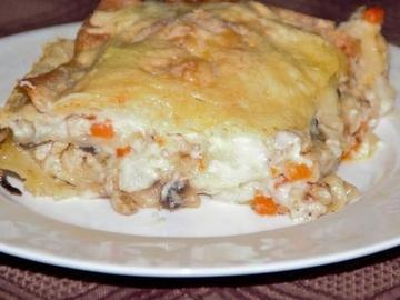 ИНГРЕДИЕНТЫ: Фарш 0,5 кг. Тонкий лаваш 3 шт. Растительное масло по вкусу. Сельдерей 1 шт. Морковь 1 шт. Лук 1 шт. Соль, черный перец по вкусу. Грибы шампиньоны 250 гр. Овощной бульон 250 мл. Сыр 150 гр. ИНГРЕДИЕНТЫ для соуса: Теплое молоко 1 л. Мука 100 гр. Сливочное масло 100 гр. Соль, мускатный орех, черный перец по вкусу.