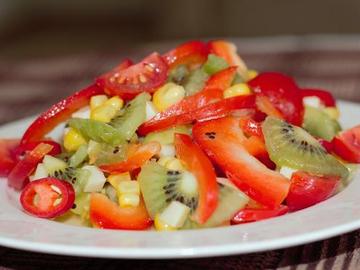 ИНГРЕДИЕНТЫ: Киви 2 шт. Сыр   50 гр. Болгарский перец 1 шт. Сок 0,5 лимона. Помидоры черри   4шт. Кукуруза   100 гр. Перец чили   0,5 шт. Оливковое масло   2 ст./л. Соль по   вкусу.