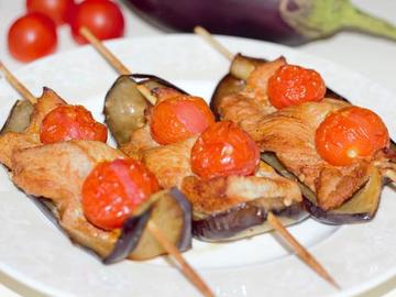 Куриное филе с баклажанами на шампурах - это аппетитное, вкусное и очень простое в приготовлении блюдо. Оно идеально подходит для приготовления летом на обед или ужин в семейном кругу или с друзьями. Ломтики куриной грудки замаринованы в наивкуснейшем маринаде, помещены на шпажку с жареными баклажанами и помидорами черри. Несколько минут в духовке, и шашлычки готовы.