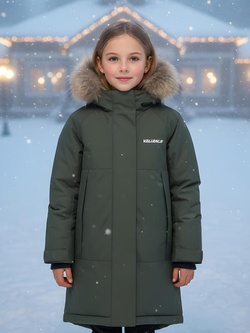 Парка зимняя подростковая для девочки с капюшоном и мехом темно-зеленого цвета 9536TZ