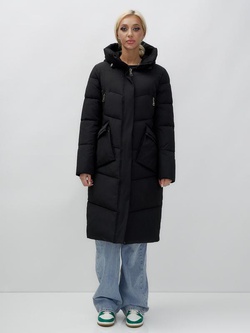 Пальто утепленное стеганное зимнее с капюшоном женское черного цвета 9639Ch