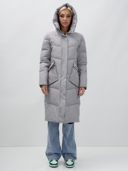 Пальто утепленное стеганное зимнее с капюшоном женское серого цвета 9639Sr