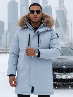 Парка зимняя мужская с капюшоном и мехом енот синего цвета 9537-1S