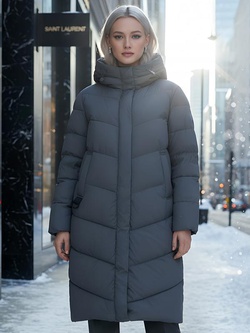 Пальто зимнее утепленное с капюшоном женское темно-серого цвета 7623TC