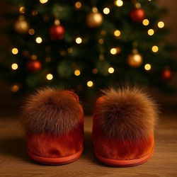 Тапочки из овчины с помпоном/закрытые/оранжевый