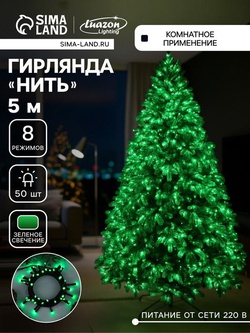 Гирлянда «Нить» 5 м, IP20, прозрачная нить, 50 LED, 8 режимов, 220 В, свечение зелёное