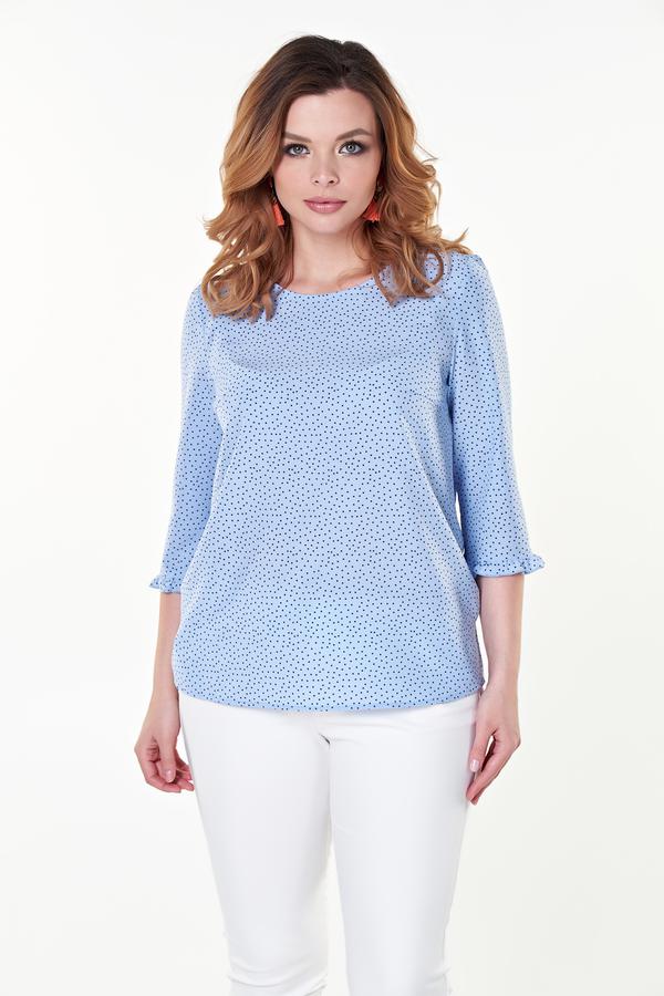 Очаровательная блузка прямого силуэта из легкой ткани с принтом "горох". Втачные рукава 3/4 дополнены оборкой. Круглый вырез горловины. Низ ровный, по бокам небольшие разрезы. Модель без застежки. Длина изделия: 46 р - 62 см; 48,50,52 р - 64 см; 54,56 р - 66 см Длина рукава: 42 см Рост фотомодели: 170 см Размер фотомодели: 48 Ткань: Ниагара