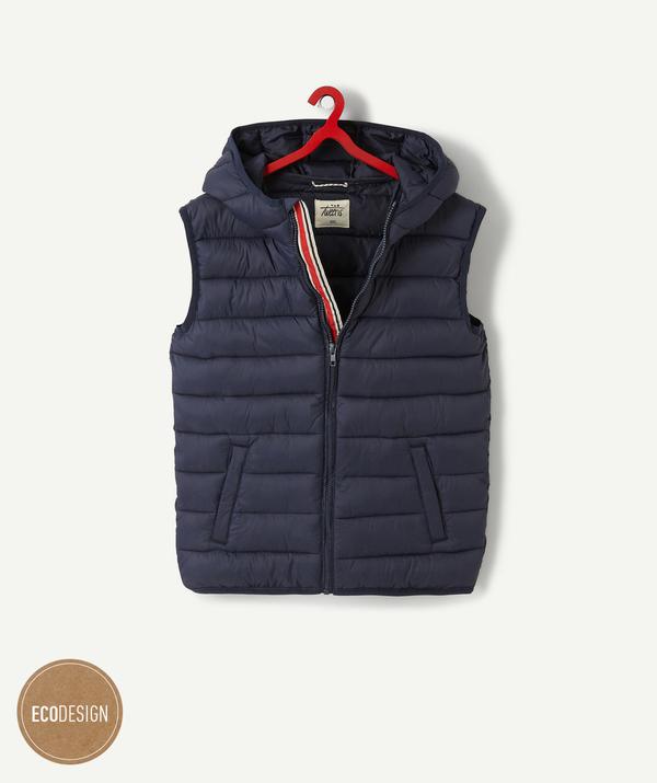 Sleeveless padded jacket, quilted and water-repellent. Central contrasting zip fastening, two pockets on the front. ECODESIGN: COTTON PRODUCED BY ORGANIC FARMING Cultivated without the use of chemicals, organic farming uses practices that respect the balance of nature. https://www.t-a-o.com/en/collection-tao-tweens/tao-tweens-boy/coat-padded-jacket-jacket/navy-blue-sleeveless-jacket-total-eclipse-93429.html