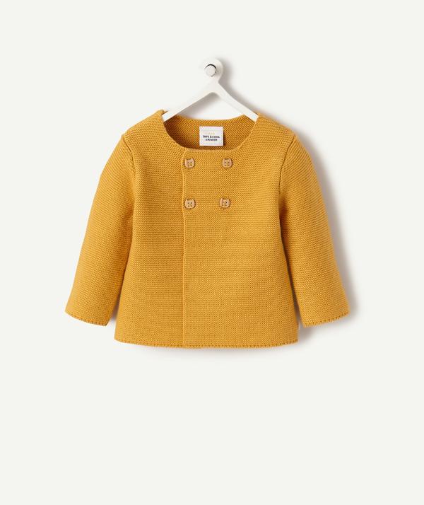 Jacket in a fine knit. Wool and cotton blend. Round neck. Double button placket with faux wood buttons. https://www.t-a-o.com/en/top/mustard-wool-jacket-honey-gold-96012.html