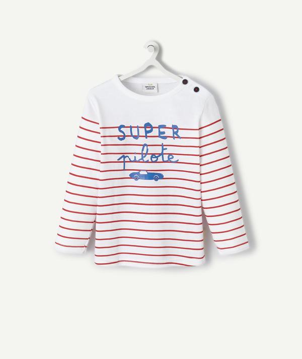 Striped t-shirt in cotton, with long sleeves and a round neck. Soft and comfortable material. Messages printed on the chest. Cotton 100% https://www.t-a-o.com/en/fashion-baby-boy/t-shirt/t-shirt-with-red-printed-stripes--haute-red-93239.html
