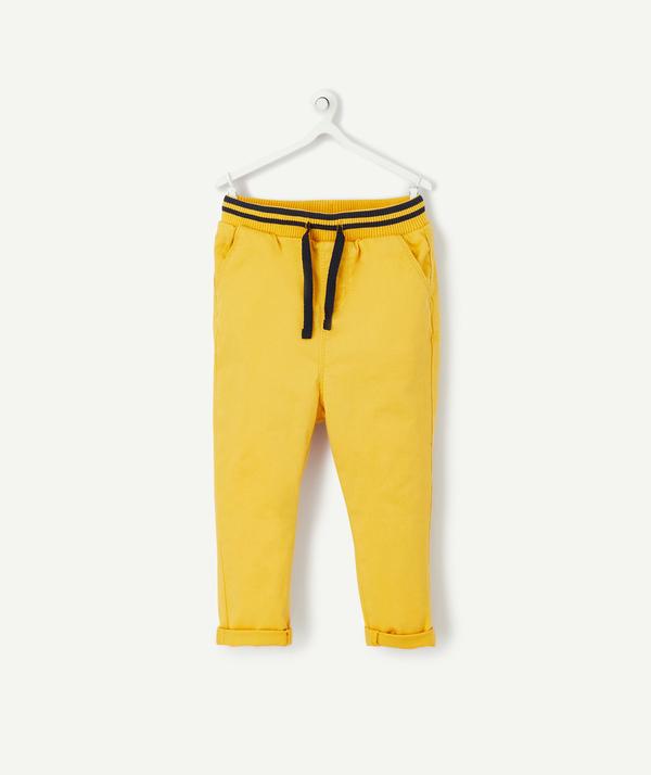 Trousers in a cotton blend with a fancy elasticated waist. Contrasting drawstring cords. Cotton 98% 2% https://www.t-a-o.com/en/fashion-baby-boy/trousers/trousers--yolk-yellow-94943.html