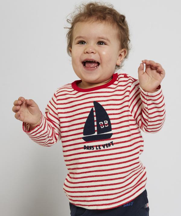 T-shirt in organic cotton. Long sleeves and a round neck. Cotton 100% https://www.t-a-o.com/en/fashion-baby-boy/t-shirt/t-shirt-in-organic-cotton-with-red-stripes-mars-red-95918.html