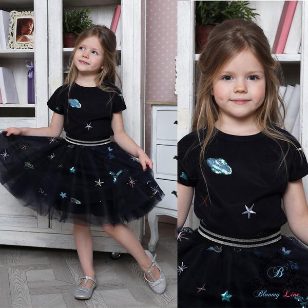 с 134-140 размера - 1360 руб. Основа - хлопок, 92% хлопок, 8% лайкра. Юбка - фатин, расшитый пайетками.