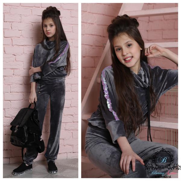 Нежнейшие костюмы из японского велюра - станут любимой вещью в гардеробе юных модниц. Отличительная черта японских велюров в том, что они имеют хлопковую основу (с добавлением лайкры) и вискозный ворс. Они по настоящему очень приятные в носке, легкие в уходе, стильные и модные! Обратите внимание! В данной модели костюма брюки свободного кроя.