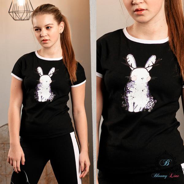 Футболка свободного кроя, декор зайка нанесен методом прямой печати по ткани.