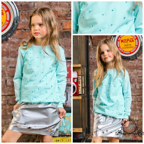 Перед свитшота украшена бусинами под жемчуг и стразами Укороченные и широкий рукава, придают свитшоту романтичность образа
