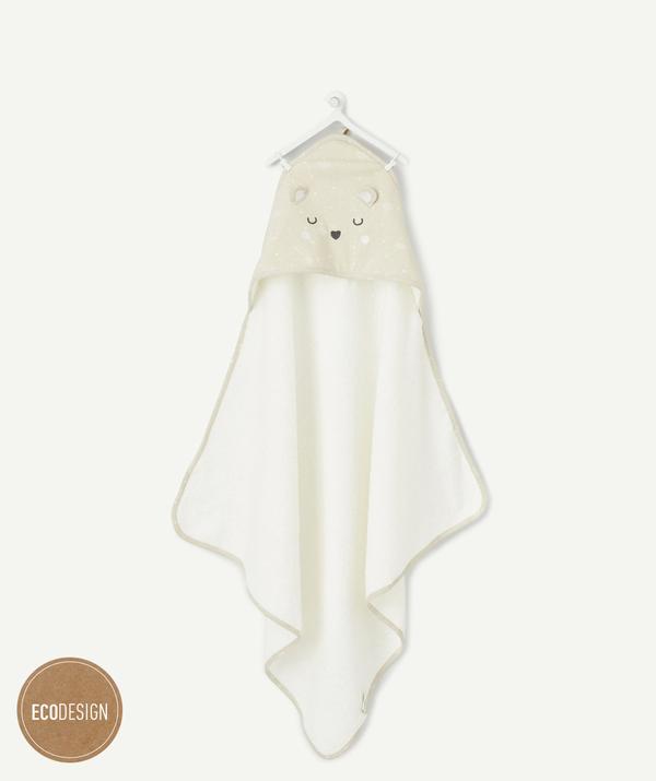 Large bath cape with built-in hood in organic cotton. Relief design. Exterior in velvet and interior in towelling. ECODESIGN: COTTON PRODUCED BY ORGANIC FARMING Cultivated without the use of chemicals, organic farming uses practices that respect the balance of nature. Cotton 100% https://www.t-a-o.com/en/collection-newborn/unisex-newborn/essentials-50-off-2nd-item-/beige-cotton-bath-cape-in-organic-cotton-snow-white-93218.html