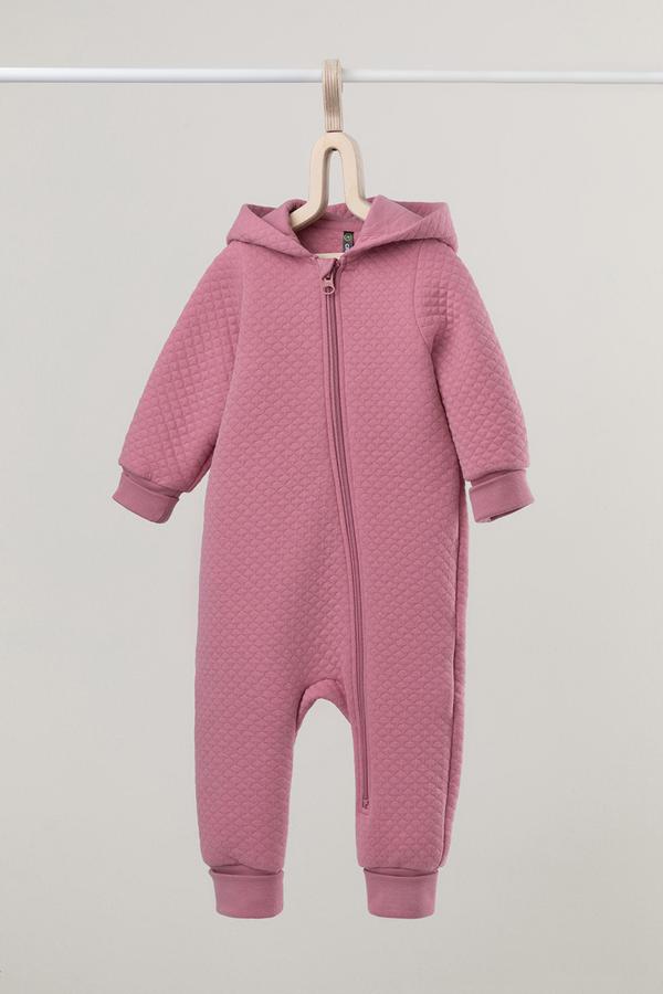 Тёплый комбинезон из капитония для новорождённых. Капитоний – это стёганое трикотажное полотно с утеплителем из полиэстеровой нити. Изделие застёгивается на молнию и имеет капюшон с подкладом из супрема. На рукавах и ножках эластичные манжеты из рибаны. Все трикотажные полотна производятся в соответствии с нормами Швейцарского сертификата ЭкоТекс.