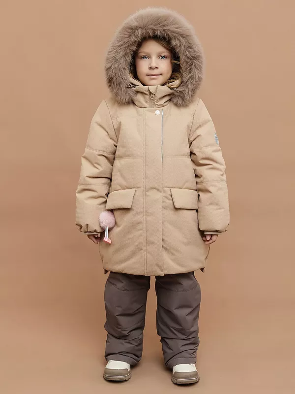 Комплект для девочки "Джинни" в нежном бежевом оттенке - это элегантное сочетание стиля и комфорта. Универсальный цвет создает уютный образ, а продуманная конструкция обеспечивает надежную защиту от зимних холодов.