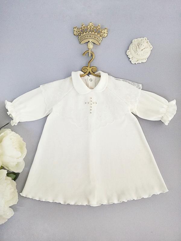 Очень нежная крестильная модель для девочки.Рукав реглан с рюшкой и резиночкой по низу.Рубашка украшена кружевом.Застежка по центру спинки.Интерлок 100%