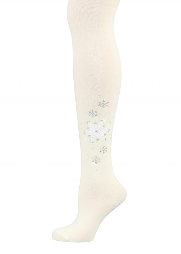 Колготки для девочки, украшены сбоку аппликацией из гипюра со стразами в виде снежинок. Интересный и необычный вариант для Новогодних праздников. Не маломерят, при выборе лучше ориентироваться на больший рост. Предварительная стирка обязательна. Рекомендовано стирать вручную. Не гладить.