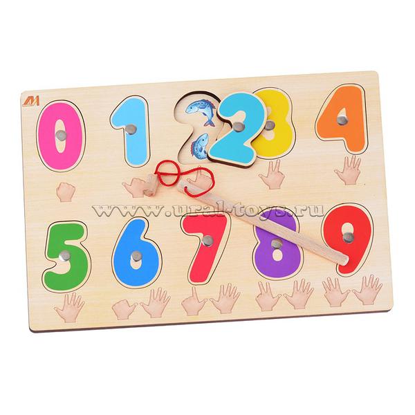 • В наборе: • рамка. • 10 цифр-вкладышей. • удочка с магнитом. • Материал: дерево. • Соответствует требованиям безопасности и стандартам качества продукции. • Для детей от 3-х лет.