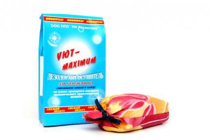 Действие Поглощает запах. Впитывает влагу. Защищает продукты от застоявшегося запаха. Показание к применению Рекомендуется для устранения лишней влаги в холодильной камере и застоявшегося запаха. Противопоказания Противопоказаний нет. Способ применения Дезодорант-осушитель достать из упаковки и поместить в холодильную камеру на одну из полок или на дверь. Для удобства желательно иметь два дезодоранта. Один поместить в холодильник, а когда он ослабит свои свойства, просушить его, а в холодильник поместить второй дезодорант. При таком использовании способность впитывать влагу сохраняется. Способность поглощать запах может быть утрачена через два месяца после начала использования. В этом случае надо приобрести новый дезодорант.Вы можете восстановить способность дезодоранта поглощать запах. Для этого нужно развязать мешок, поместить содержимое в банку с гипертоническим раствором поваренной соли на сутки, время от времени перемешивая. Затем промыть под струей воды, высушить, поместить в мешок. Утилизация Отработанный материал может быть использован в качестве удобрения. Форма выпуска Цеолитовая крошка в тканевом мешке весом по 250 граммов в бумажном пакете. Условия хранения Хранить при любой температуре в сухом темном помещении. Срок действия – 2 месяца с начала использования. Срок хранения в фабричной упаковке не ограничен. Серия, линия Серия «Уют – maximum».