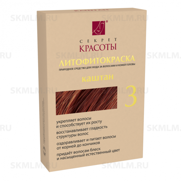 Действие Обеспечивает интенсивный естественный цвет на 1–1,5 месяца. Укрепляет волосы и волосяную луковицу. Устраняет перхоть, зуд. Увеличивает толщину и упругость волоса. Восстанавливает кожу головы. Приостанавливает процесс поседения волос. Показание к применению Рекомендуется для безопасного окрашивания волос в каштановый цвет. Эффективное средство восстановления и укрепления волос. На тонких волосах прекрасно прокрашивает седину, на толстых волосах с проседью дает эффект тонирования. Противопоказания При непереносимости одного из компонентов препарата. Способ применения Литофитокраску развести горячей водой температуры не выше 80°C и тщательно перемешать до состояния жидкой сметаны. Перед окраской волосы необходимо вымыть, подсушить и расчесать. Очень удобно наносить литофитомаску просто рукой в перчатке, втирая ее в кожу головы, и проминая с ней волосы. После нанесения литофитокраски на кожу головы и волосы обвязать волосы полиэтиленовой пленкой или смоченной горячей водой пергаментной бумагой, закутать голову полотенцем и дать нужную выдержку. После этого волосы нужно хорошо промыть теплой водой и ополоснуть подкисленной водой. Окрашивать волосы рекомендуется не реже 1 раза в месяц. При окрашивании седых волос для получения хорошего прокраса нужно повторять процедуру 1 раз в неделю в течение месяца, а затем красить волосы 1 раз в месяц. Форма выпуска Мелкодисперсный порошок в полиэтиленовом пакете весом 30 грамм в картонной коробке. Условия хранения Хранить при любой температуре в сухом темном помещении. Срок годности – 2 года. Серия, линия Серия «Секрет Красоты»