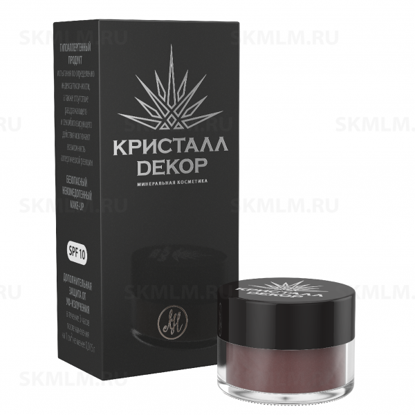 Тени – это основной штрих в создании макияжа с минеральной декоративной косметикой «Кристалл Dекор». Матовые тени «Мокко» могут наноситься как соло на всю поверхность подвижного века, создавая вечерний насыщенный макияж, так и использоваться в для моделирования глаза. Действие: делает взгляд выразительным, элегантным; помогает создать глубину макияжа, оттенить цвет глаз; в сочетании со светлыми оттенками, помогает создать контрастный макияж. Продукт можно протестировать заказав пробник данной позиции. Тонкости применения Плоской маленькой кистью наберите достаточное количество теней, стараясь распределить их по всему ворсу. Нанесите оттенок на подвижное веко. Для придания сияния можете использовать шиммер. Для акцентирования в макияже обмакните кисточку, стряхните излишки, следуя линиям, проведите во внешнем углу глаза линии, затем тщательно растушуйте. Для создания более яркой линии подводки слегка намочите тонкую кисть, обмакните в тени и проведите линию по контуру роста ресниц. Подробная инструкция с рекомендациями по созданию макияжа находится внутри каждой упаковки. Форма выпуска Мелкодисперсный порошок в упаковке весом 1,5 грамм. Условия хранения Хранить в сухом месте в закрытой банке. Не допускать попадания влаги внутрь. Срок годности 5 лет