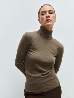 Водолазка темно-бежевого оттенка. Выполнена из вязаного трикотажа. Базовая лаконичная модель: отлично подойдет для создания повседневного образа в сочетании с брюками из экокожи или с рубашкой, в качестве нижнего слоя.