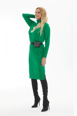 Платье трикотажное, свободного силуэта. Рукав длинный, реглан. Воротник-стойка, высокий. В комплекте ремень-сумочка. Модель представлена в размере “one size” (44-48).