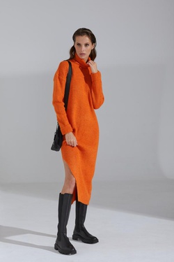 Платье трикотажное облегающего силуэта. Длина миди. Рукава длинные. Низ рукава с отложной манжетой. Воротник – стойка. В правом боковом шве разрез (39 см.). Модель представлена в размере “one size” (44-48).