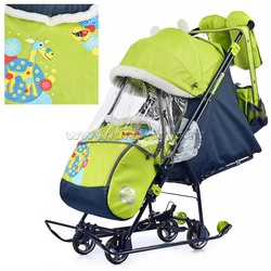 • плоские полозья 30 мм. • облегченный складной каркас на круглой металлической трубе. • механизм смены полозьев на колеса (выдвижная колесная база). • высокий складной трехсекционный козырек с увеличенной высотой по спинке позволяет чувствовать себя комфортно малышу в шапке с помпоном. • козырек с меховой окантовкой и декоративными ушками. • спинка регулируется до положения лежа. • подножка для ног с регулируемым углом наклона, позволяющая ребенку в положении лежа комфортно вытягивать ножки. • перекидная ручка. • чехол для ног с 2-мя молниями для удобного открывания с двух сторон. • светоотражающий кант. • широкое посадочное место. • смотровое окошко для наблюдения за ребенком. • яркий рисунок на чехле. • съемный меховой матрасик и отделка мехом. • рукавички с мехом. • новый дизайн сумки с кармашками для полезных мелочей. • пятиточечный ремень безопасности. • съемный прозрачный тент от ветра и дождя с двумя молниями, крепится к чехлу коляски на пуговицу. • обрезиненные колеса на полозьях для удобной транспортировки. • размер 1010 х 416 х 990 мм. • вес: 9,8 кг.