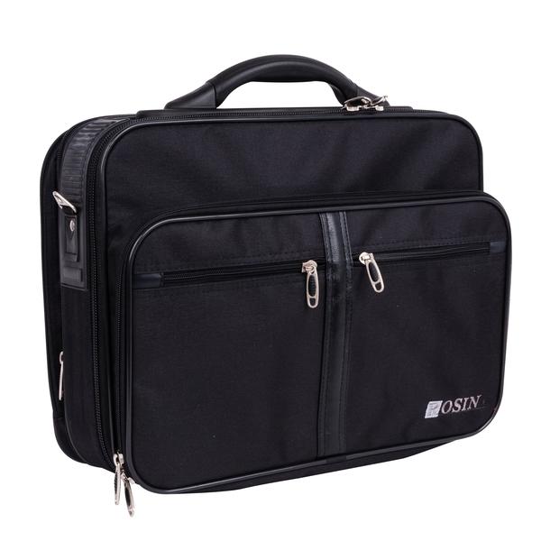 Кейс тканевый компании ROSIN. Внутри основного отделения органайзер, два кармана на липучке и фиксаторы для документов. Имеется расширение на молнии на 5 см. На передней части расположен большой карман на молнии, внутри которого расположены один карман на липучке и три открытых кармана, и два кармана на молнии. Сзади карман на молнии под документы. В комплекте съемный плечевой ремень.