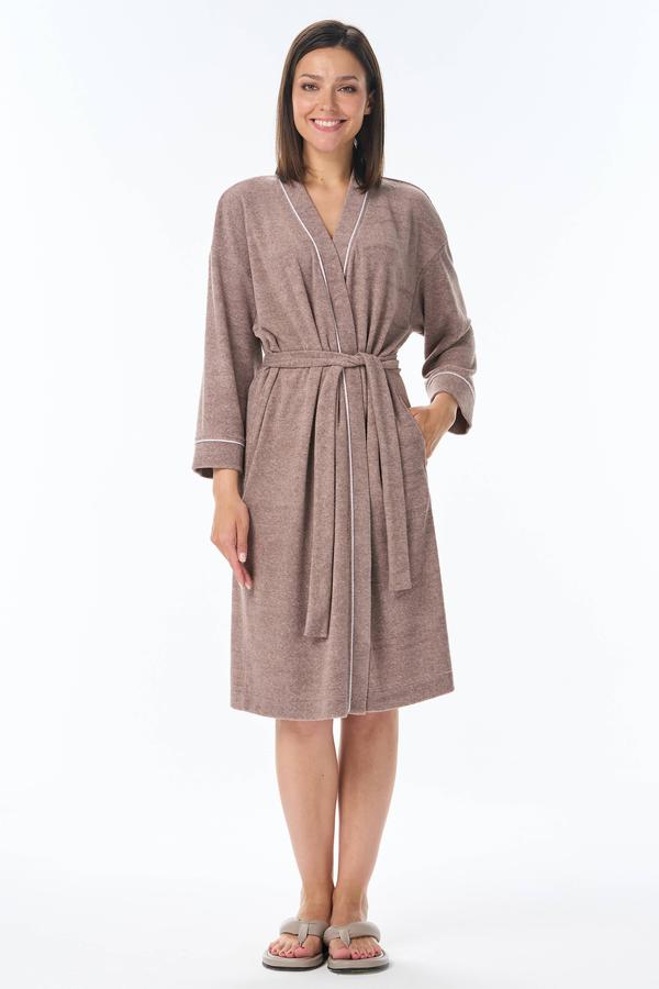 Комфортный халат с запахом из махрового трикотажного полотна. Без воротника, в рельефных швах карманы. Длинна рукавов 7/8 с манжетами. Рост модели 170см.
