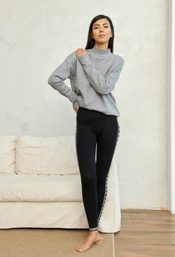 Название «экокашемир» получил от практически идентичных тактильных ощущений, но в разы дешевле, так как в составе присутствуют синтетические продукты. Разные производства имеют разную формулу эко-кашемира, зачастую даже без присутствие натуральной шерсти. Преимущества нашего состава — 30% шерсть овцы, 50% вискоза и 20% спандекс! Лосины из «экокашемира» с орнаментом сбоку приятны к телу, комфортны и практичны в носке. Леггинсы не просвечивают, отлично садятся на любую фигуру и обладают легким корректирующим эффектом. Идеально подойдут для осени, умеренной зимы и начала весны. Лосины прекрасно сочетаются с вещами из базового гардероба: футболками, свитерами, джемперами, рубашками и жакетами.