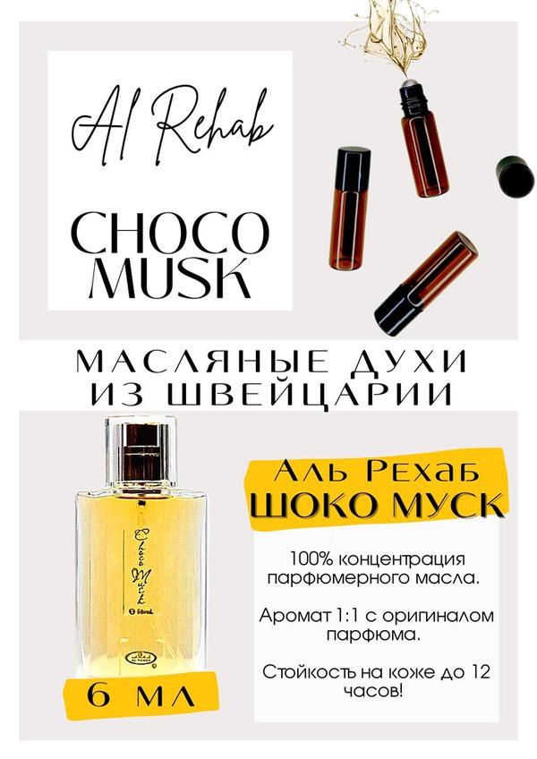 Choco Musk Al-Rehab - это аромат для мужчин и женщин, он принадлежит к группе восточные гурманские. слышится молочная шоколадка с оттенками алкоголя, при нанесении на кожу усаживается, становится мягче, карамельная сладость. Похож на Montale Chocolate Greedy. Арабские духи многим напоминает запах ароматной, теплой выпечки, так же, как и Шоко Муск. Чоко Муск Аль Рехаб. PARFUM - магазин ароматных, высококачественных масляных духов из Швейцарии. Парфюмерные композиции по мотивам известных брендов. 100% содержание масел в парфюме. Без спирта. Стойкость на высшем уровне. Формат мини парфюма удобно брать с собой. Парфюм во флаконе в виде ролика. Минимальный расход. Купить масляные духи известных брендов можно у нас. Переходи в наш магазин и выбирай!