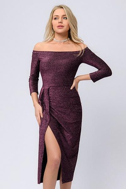 / Платье бордовое с открытыми плечами и драпировкой на юбке