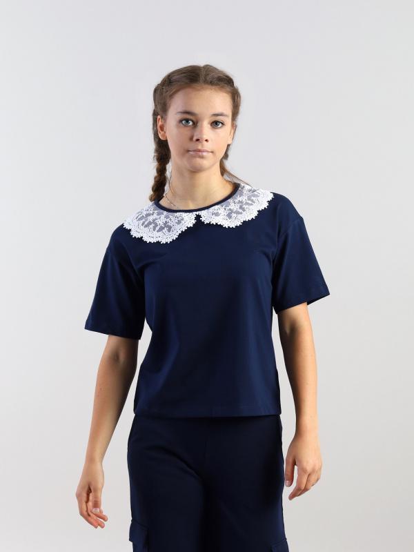 <ul><li>Бренд: CRB</li> <li>Цвет: темно-синий</li> <li>Материал: Кулирная гладь</li> <li>Сезон: Школа</li> <li>Состав: 92% хлопок, 8% эластан</li> <li>Пол: Девочка</li> <li>Артикул: CWJG63916-41</li></ul><br/><br/>Джемпер для девочки свободного силуэта с короткими рукавами. Горловина круглая, оформлена декоративным воротником из кружева. В верхней части спинки обработана застежка "капелька" на пуговицу.