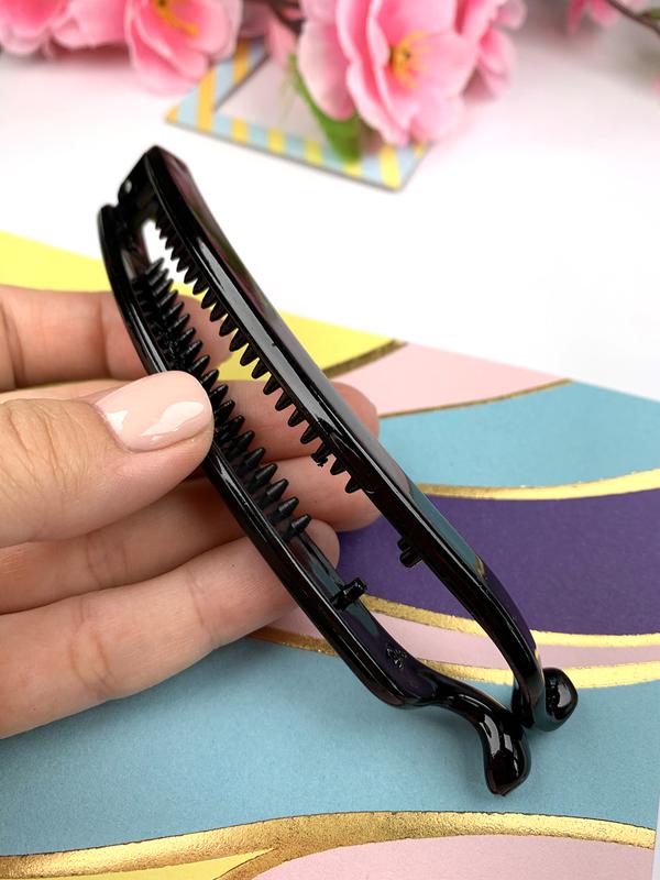 Этот маленький банан изготовлен из пластика. Заколка отлично подойдет для делового образа, так как имеет строгие очертания и неброский цвет. Глянец приятно оттенит цвет ваших волос