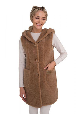 НОВИНКА!!! Стильный меховой жилет из натуральной овечьей шерсти! Удлиненная модель. Материал облегченный, высота ворса 7 мм, мягкий, пластичный, подходит для верхнего и среднего слоя одежды. Жилет имеет прямой силуэт, просторный капюшон, два глубоких меховых кармана, застежка - пуговицы.