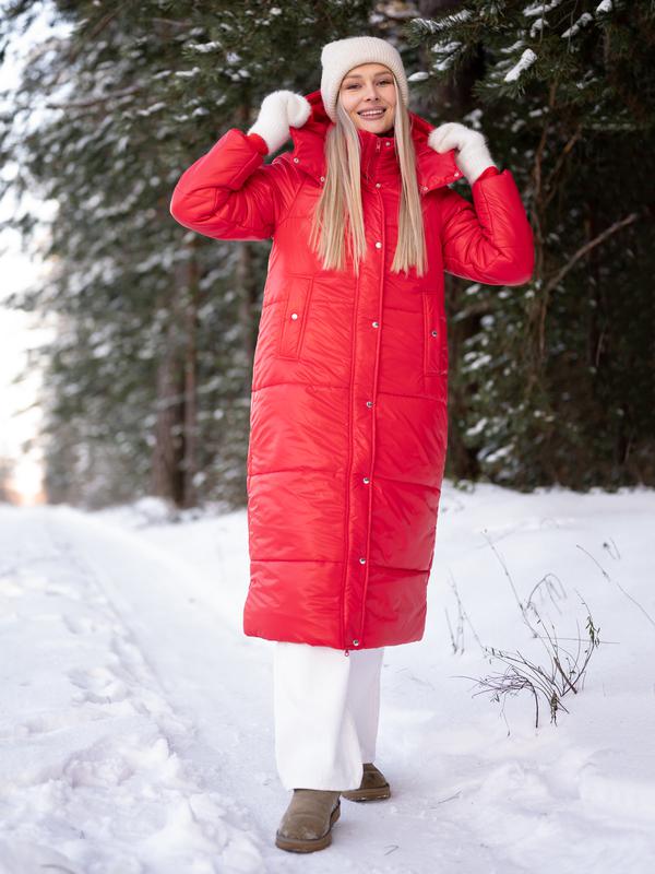 Зимнее женское пальто в повседневном стиле: - глянцевая ткань - свободный крой - удлиненная модель - отстегивающийся капюшон - затяжка на фиксаторах по капюшону - карманы на кнопках - верхний ветрозащитный клапан на кнопках - трикотажные манжеты на рукавах Размеры: 40-54 Состав: 100 % полиэстер Материал подкладки: 100 % полиэстер Утеплитель: 100 % полиэстер (300 г/кв.м синтепон) Размер товара на модели: 42 Сезон: зима Температурный режим: до -25 градусов Застежка: молния Стиль: повседневный Карманы: 2 Артикул: 500 Длина изделия: 115 см. Длина рукава (с плечом): 74 см.
