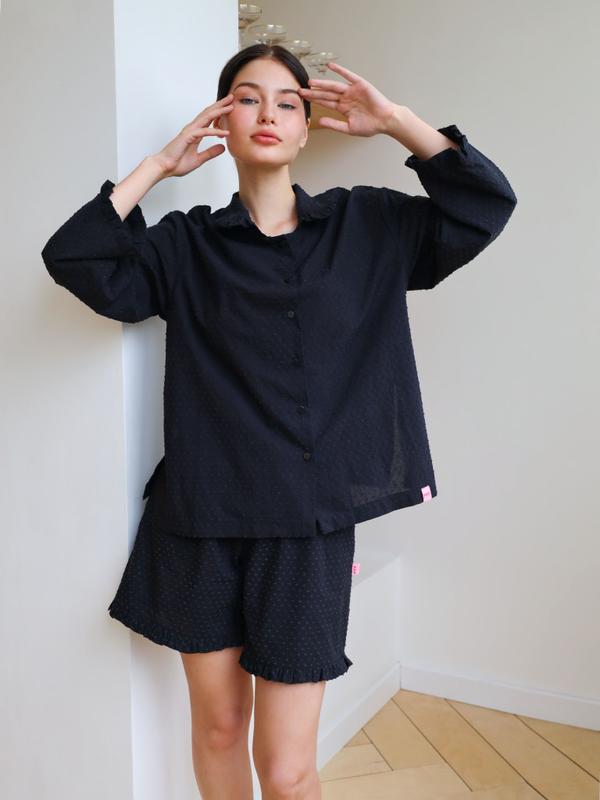 Домашяя женская рубашка оверсайз из легкого хлопкового фактурного батиста "Мушка". Легкая и воздушная рубашка прямого кроя с нежными рюшами на вороте и манжете придает образу невероятную нежность и чувственность. Рубашка прекрасно сочетается с шортами и брюками MY. Состав: 100% хлопок Обмеры изделия: Длина изделия по спинке: S/M — 71-72 см, L/XL — 74-75 см Длина изделия по переду: S/M — 66-67 см, L/XL — 68-69 см Ширина изделия под проймой (½): S/M — 56-57 см, L/XL — 61-62 см Ширина изделия по низу (½): S/M — 58-59 см, L/XL — 64-65 см Ширина рукава (½): S/M — 20-21 см, L/XL — 22-23 см Ширина горловины: S/M — 19 см, L/XL — 20 см Длина плеча: S/M — 20 см, L/XL — 21 см Длина рукава: S/M — 28-29 см, L/XL — 30-31 см Длина пояса: S/M — 200-201 см, L/XL —200-201 см Сделано в России.