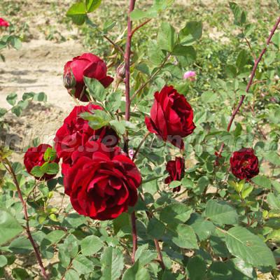 Цветки красные, полумахровые в кистях по 10-35 шт. Диаметр цветка 6-7 см. Куст колючий, с темно-зеленой блестящей, глянцевой листвой. Высота куста 150-180 см, ширина 150 см. Напоминает флорибунду.